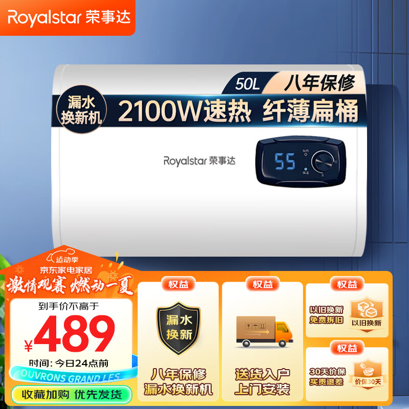 荣事达(Royalstar)50升储水式电热水器扁桶电卫生间家用洗澡省电出租房小型热水器超薄双胆速热RSD-F1-50价格:489.00元!