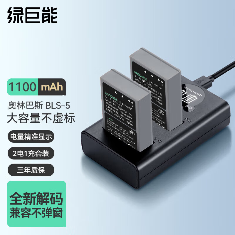 绿巨能(llano)奥林巴斯电池 BLS-5相机电池/充电器 适用EM10 EPL9 EPL8 E-PM2 E450等套装电池*2充电器*1价格:149.00元!