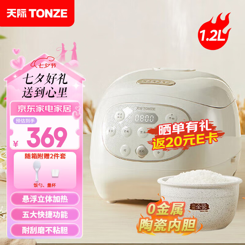 天际(TONZE)电饭煲1.2L 家用陶瓷内胆不粘电饭锅 迷你智能预约0涂层饭煲多功能1-2人煮粥蒸米饭锅 BYQC22A12GC价格:369.00元!
