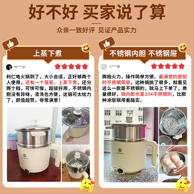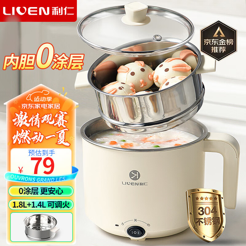 利仁(Liven)电煮锅304不锈钢0涂层内胆小电锅宿舍电煮锅电火锅多功能锅电蒸锅一体电热锅1.8升学生锅DHG-B151价格:79.00元!