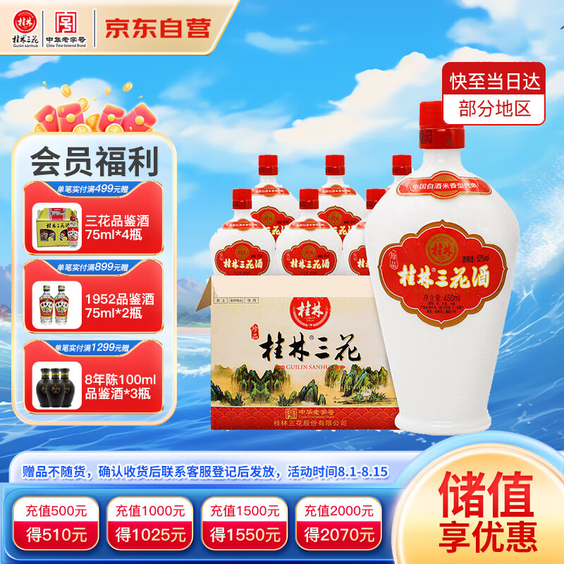 桂林三花酒 珍品乳白瓶 米香型白酒 52度450ml*6瓶整箱装广西送礼白酒价格:240.00元!