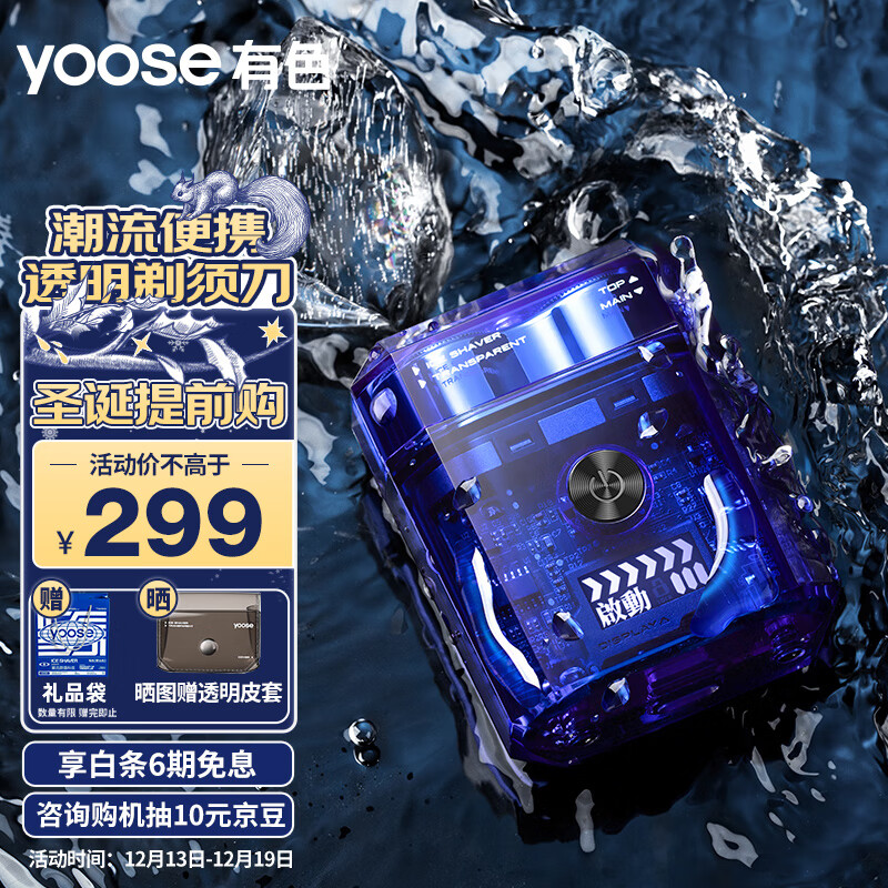 有色(yoose)男士电动剃须刀 潮流冰感便携 全身防水 送男友节日礼物 胡须刀礼盒 ICE 透明蓝价格:399.00元!