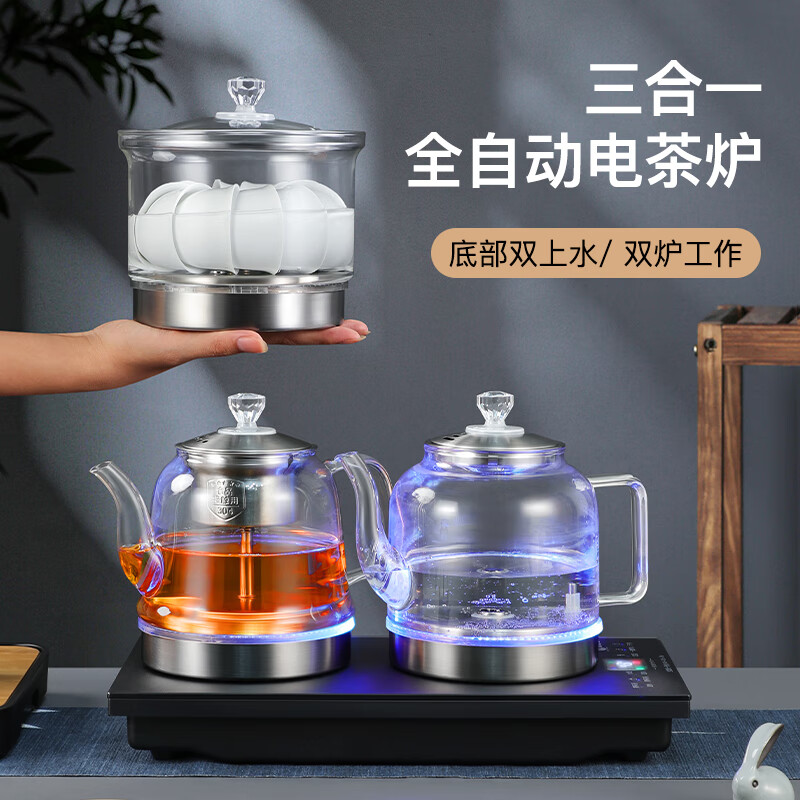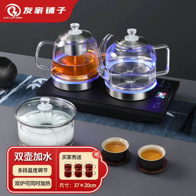 友家铺子(Biooner)全自动底部双上水电热烧水壶玻璃烧水器家用办公茶台茶桌一体嵌入式电茶炉茶具套装 磨砂黑三合一价格:369.00元!