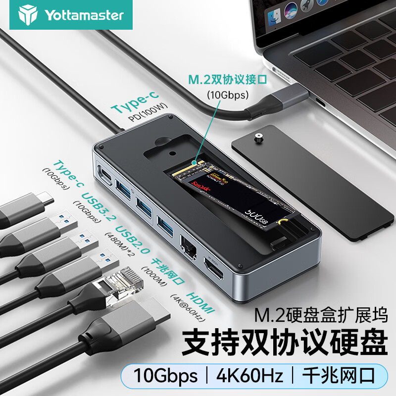 尤达大师 扩展坞Type-C M.2硬盘盒拓展坞NVMe/SATA双协议固态硬盘盒分线器USB3.2外置盒 铝合金价格:352.00元!