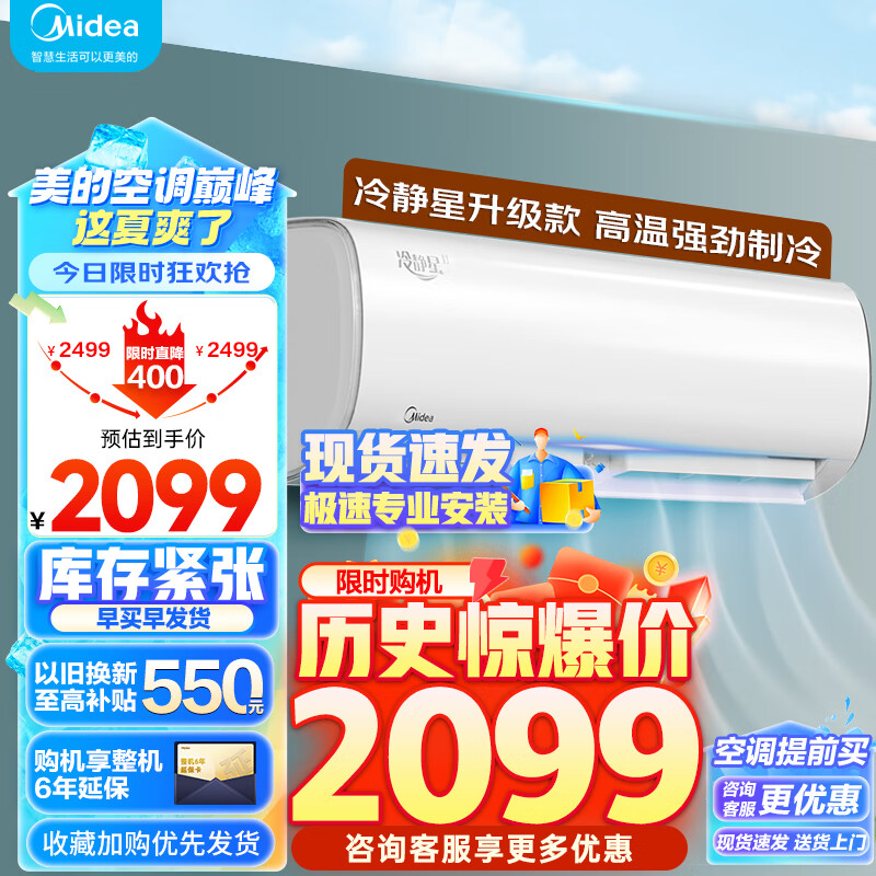 美的(Midea)空调 大1匹 冷静星二代 新一级能效 变频冷暖 壁挂式空调挂机 智能家电 KFR-26GW/BDN8Y-PH200(1)A价格:2499.00元!