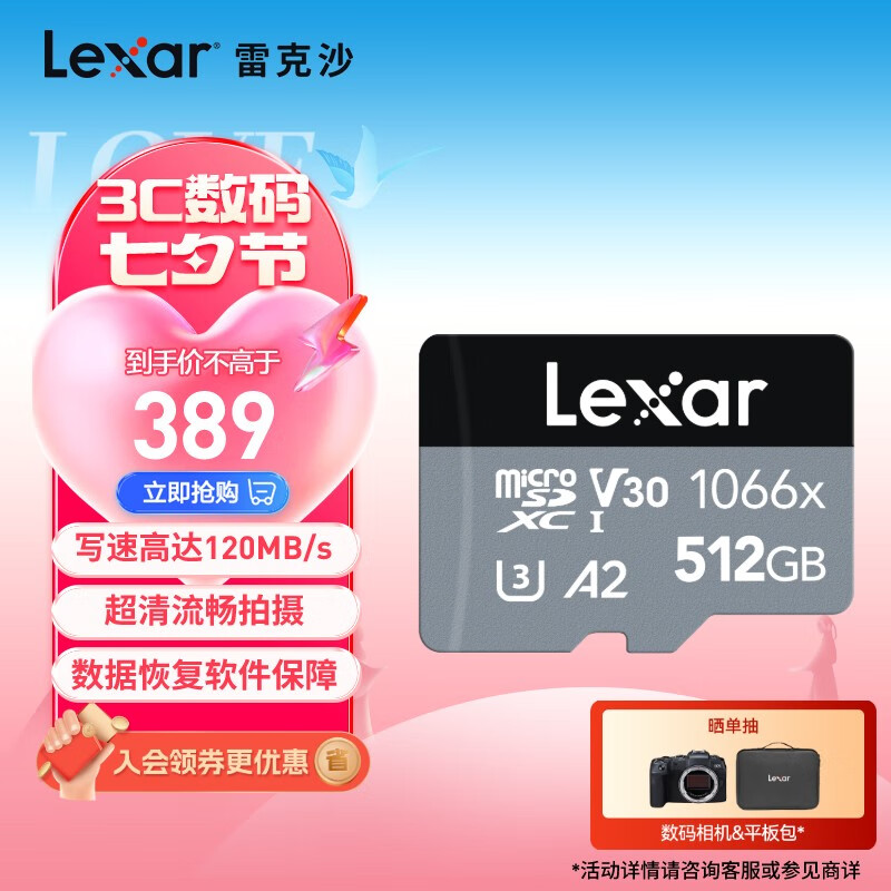 雷克沙(Lexar)512GB TF(MicroSD)存储卡 V30 读160MB/s 无人机运动相机内存卡 4K超清(1066x)价格:389.00元!