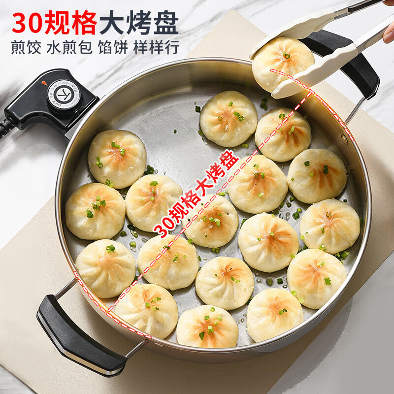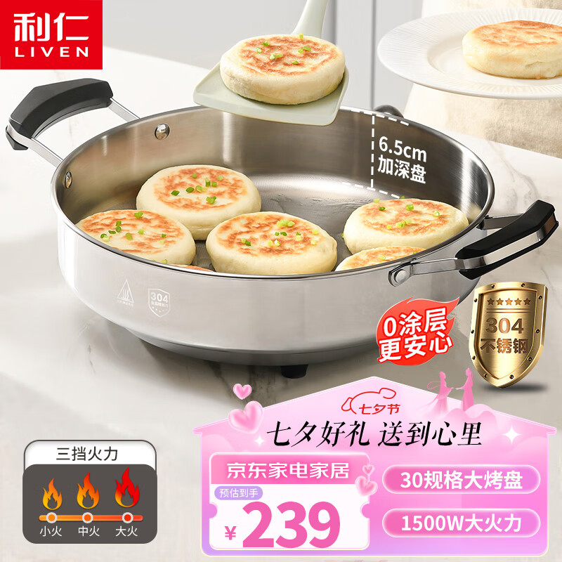 利仁(Liven)电饼铛家用电煎锅304不锈钢0涂层电饼档30cm加大煎饼锅煎烤机烙饼锅65mm加深早餐机DJG-J3265价格:239.00元!