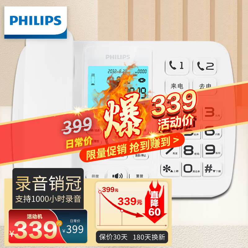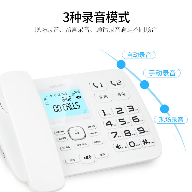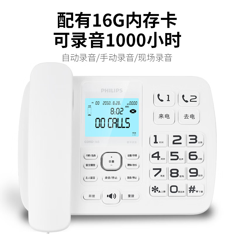 飞利浦(PHILIPS)录音电话机 固定座机 办公家用 自动 手动录音 16G存储卡 放音密码保护 CORD165 (白色)价格:339.00元!