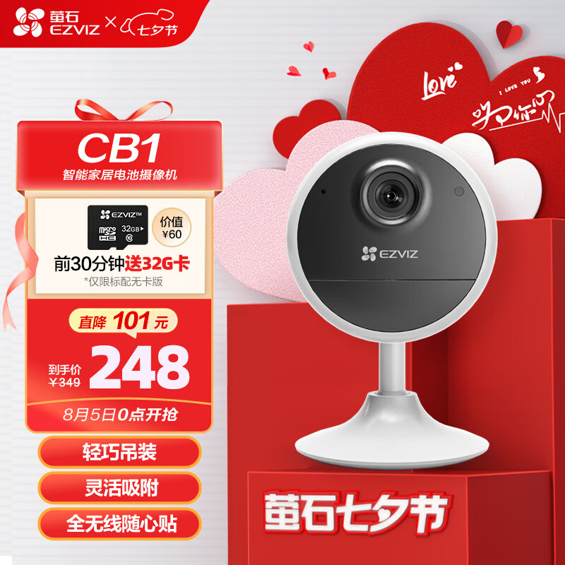 萤石CB1 200万像素智能家居电池摄像头 全无线监控网络摄像头 双向语音通话 吸附安装自带电池价格:248.00元!