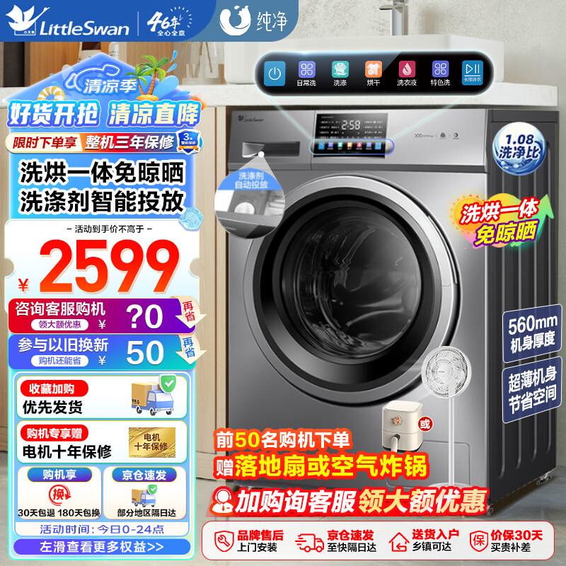小天鹅(LittleSwan)10KG洗衣机全自动智能投放一级能效洗烘一体机幻彩触控空气洗除螨洗纯净系列TD100V23WIDY价格:2599.00元!