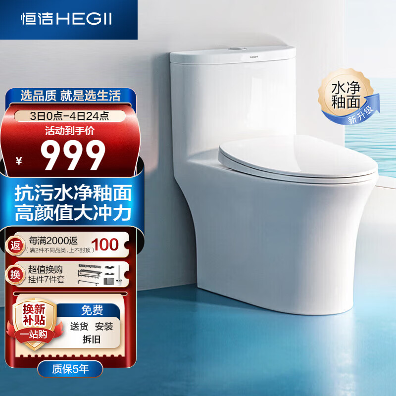 恒洁(HEGII)马桶506 水净釉面家用大冲力虹吸式坐便器HC0506PT-400价格:1099.00元!