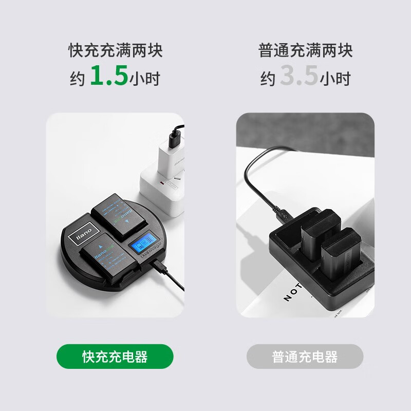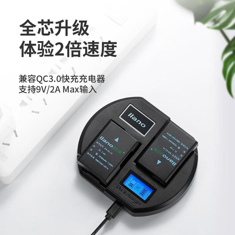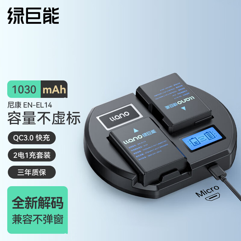 绿巨能(llano)尼康电池 EN-EL14相机电池 QC3.0快充充电器D3200 D5100 D5500 P7000充电套装电池*2充电器*1价格:209.00元!