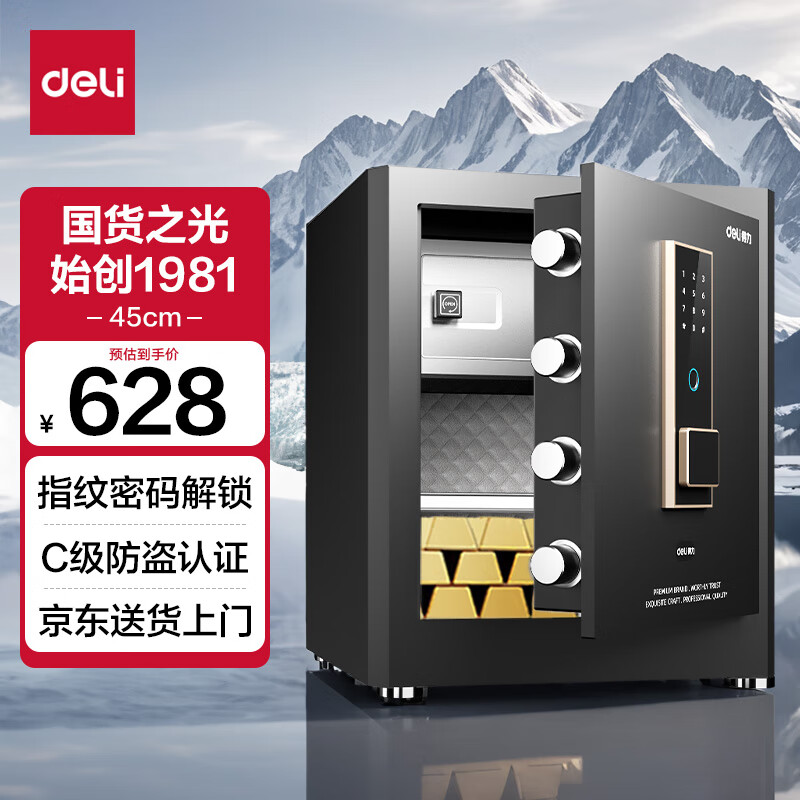 得力保险柜 家用办公指纹密码保险箱小型财务专用保密箱防盗可入墙入柜保管柜 45cm曜岩黑 弘雅系列价格:658.00元!