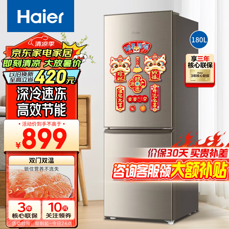 海尔(Haier)180升冰箱双开两门 家用宿舍寝室出租房用小型节能省电冰箱 深冷速冻价格:899.00元!