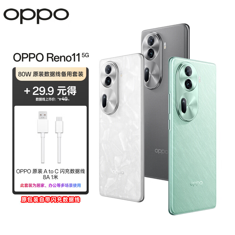 OPPO Reno11 单反级人像 天玑8200 12GB+512GB 萤石青 学生5G AI拍照手机【闪充数据线备用套装】价格:2828.90元!