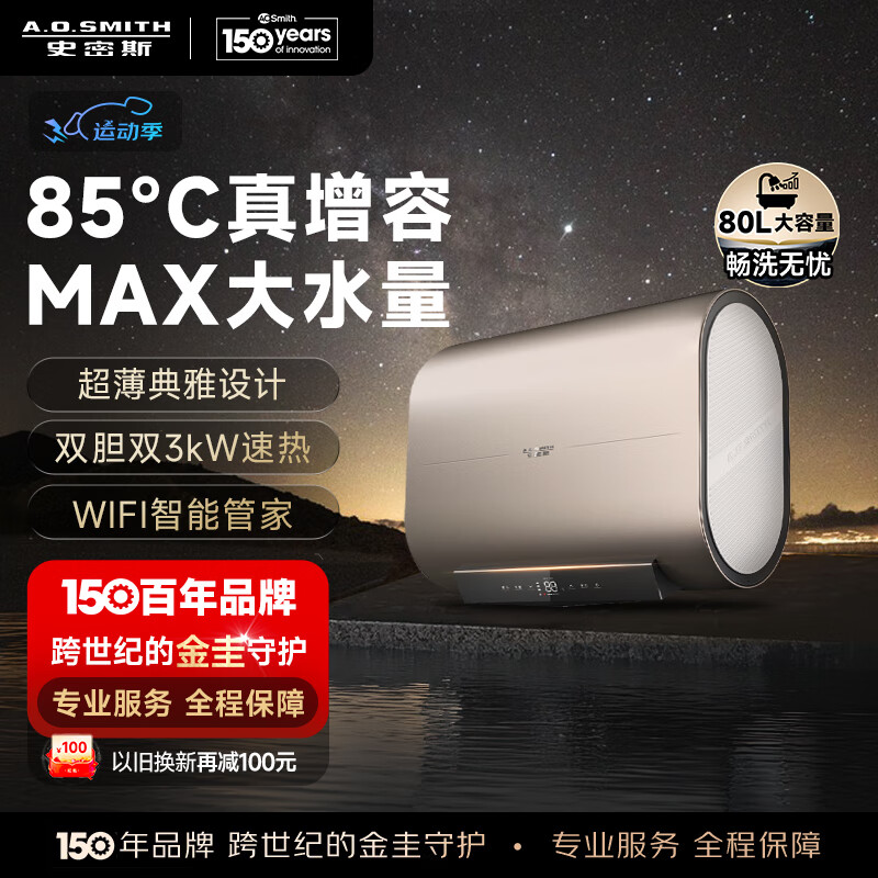 史密斯(A.O.SMITH)80升电热水器 超薄双胆扁桶 金圭特护 双3kW速热 AI-link智能 85度真增容 E80HGDWi 以旧换新价格:4998.00元!