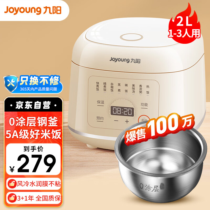 九阳(Joyoung)电饭煲1-3人小型迷你0涂层不锈钢不粘家用2L电饭锅20N1价格:279.00元!