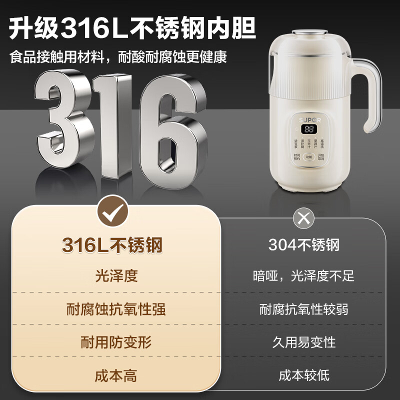苏泊尔(SUPOR)豆浆机 细腻免滤 家用小型破壁机全自动免煮12h可预约316L不锈钢搅拌机自清洗料理机 DJ08B-P69E价格:239.00元!