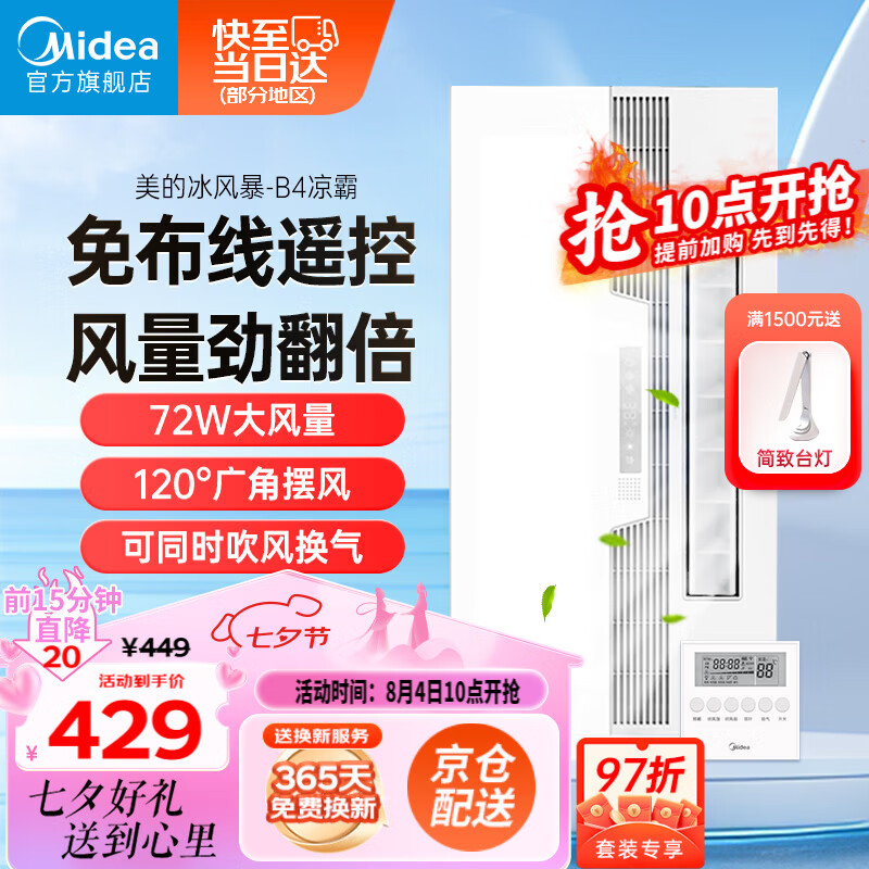 美的(Midea)凉霸厨房卫生间集成吊顶照明一体冷霸冷风机遥控摆风排气换气吹风价格:449.00元!