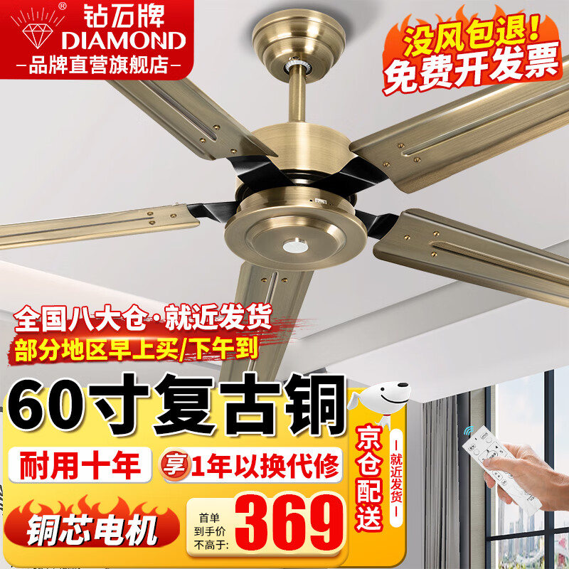 钻石牌(DIAMOND) 吊扇大风力家用客厅餐厅工厂吊风扇装饰风扇五叶纯铜芯工业吊式电风扇 5310古铜色/遥控开关(60吋)价格:409.00元!