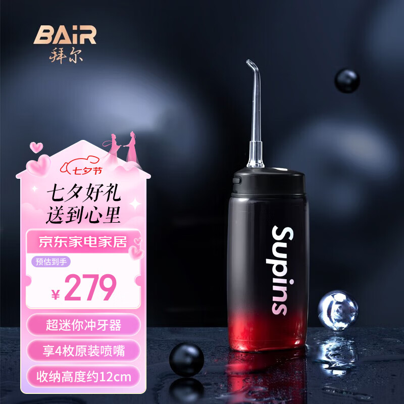 拜尔(BAIR)V2小不点 迷你冲牙器 便携式正畸电动洗牙器家用洁牙水牙线冲洗器 送女男朋友礼物 酷爽黑(4枚原装喷嘴,折叠后约12厘米) 4支喷头价格:329.00元!