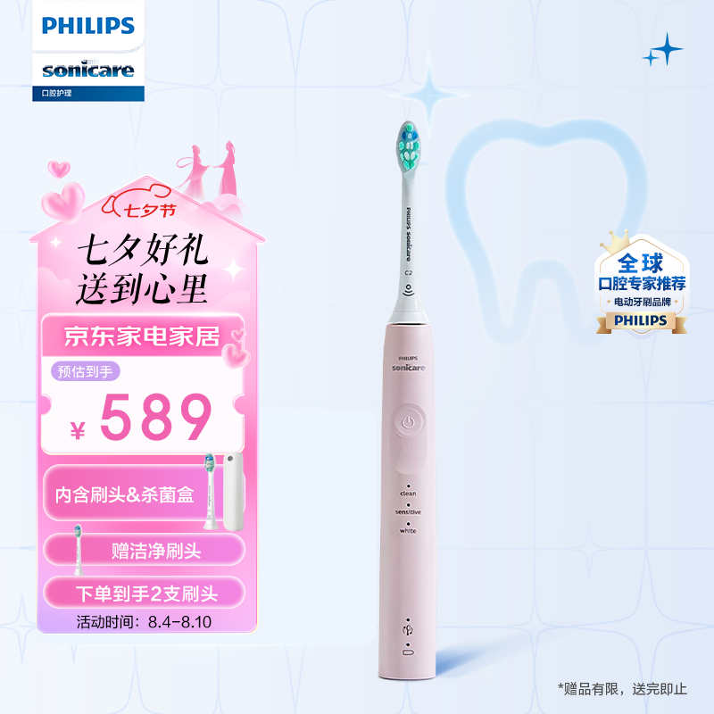 飞利浦(PHILIPS)电动牙刷成人 情侣款送男/女友礼物 健康护龈系列 3种模式7倍清除牙菌斑粉色HX3697/21价格:619.00元!