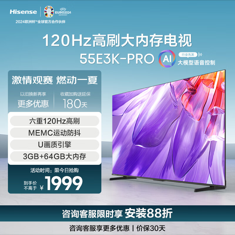 海信电视55E3K-PRO 55英寸 4K六重120Hz高刷 MEMC防抖 U画质引擎 智慧屏 液晶智能平板电视机 55英寸价格:2699.00元!