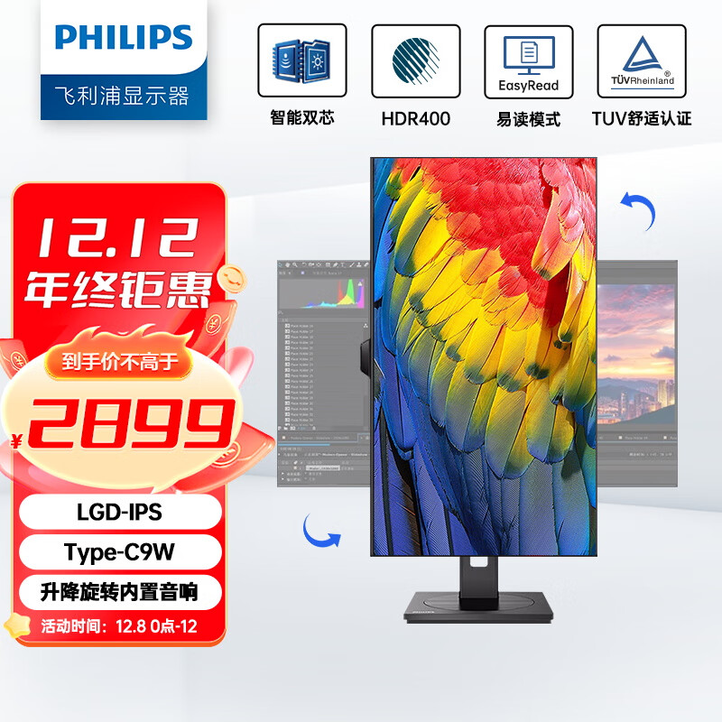 飞利浦 27英寸显示器 4K LGD-IPS屏 HDR400 Type-C90W+RJ45 内置音响 旋转升降 智能双芯 电脑显示屏279P1FR价格:2899.00元!
