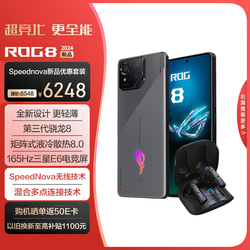 ROG8 AI游戏手机 16+256风暴灰 骁龙8Gen3矩阵式液冷散热8.0 165Hz高刷【speednova耳机优惠组套版】价格:6248.00元!