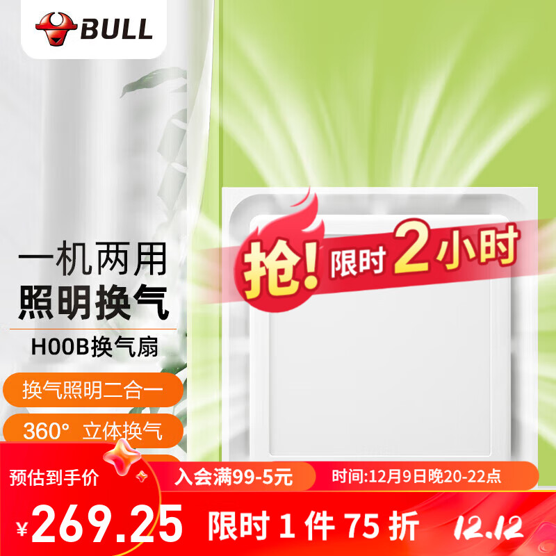 公牛(BULL)排气扇集成吊顶换气扇GH00BJZ换气照明二合一大功率排风价格:359.00元!