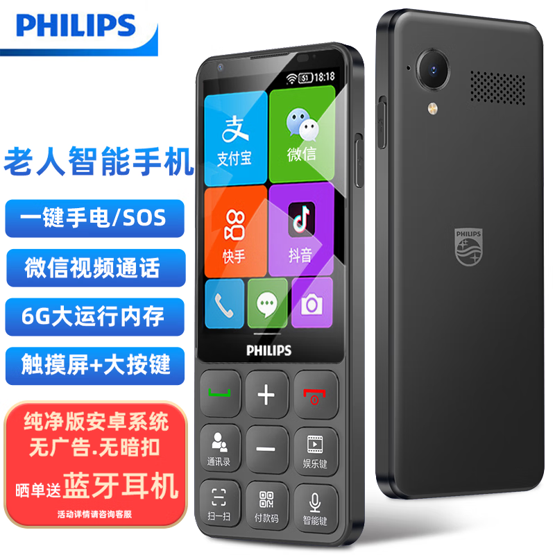 飞利浦(PHILIPS)E6820 老人智能手机 超长待机 触摸屏按键老年机 4G通双卡双待 64G学生备用机 星空黑价格:679.00元!