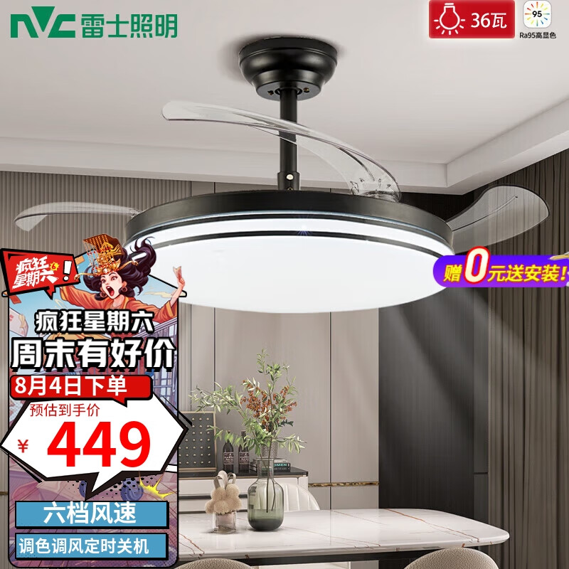 雷士(NVC)风扇灯吊扇灯餐厅卧室现代简约高显指变频黑色42寸36瓦价格:499.00元!