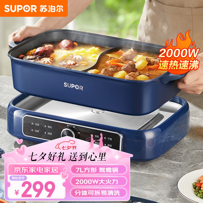 苏泊尔(SUPOR)电火锅 多功能电煮锅 火锅专用锅 分体式家用涮肉鸳鸯电热锅 7L多用途锅H3925FK872Y价格:289.00元!