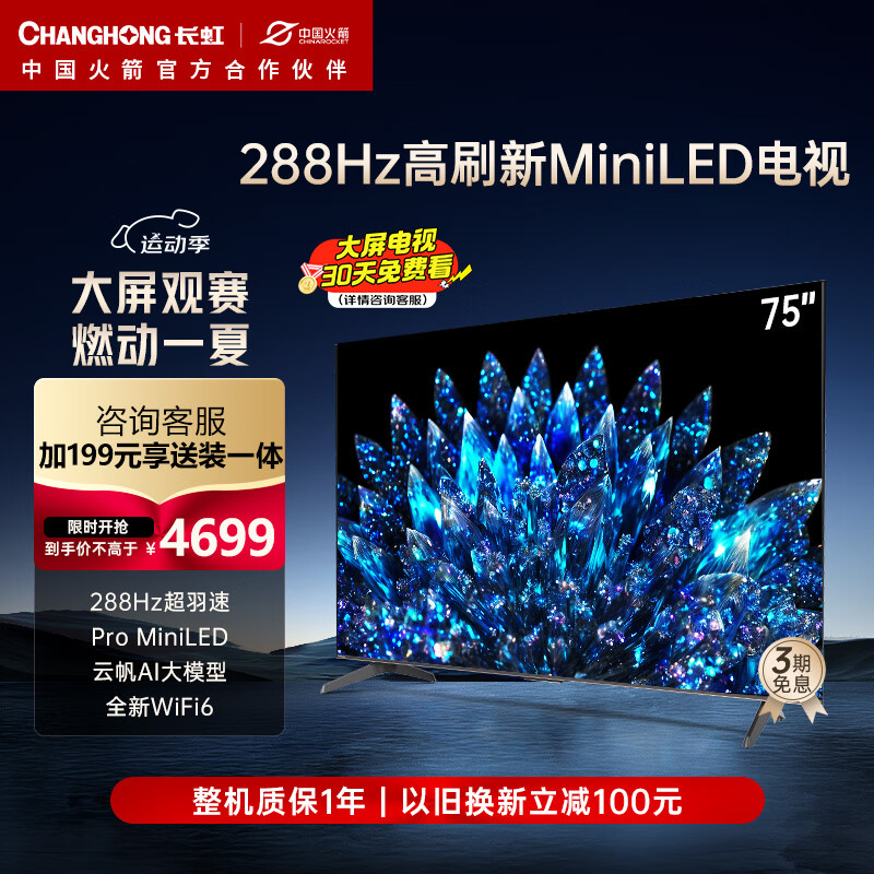 长虹电视75D8 MAX 75英寸288HzMiniLED游戏电视 4+64GB 4K超高清智能平板液晶LED电视机以旧换新价格:4699.00元!