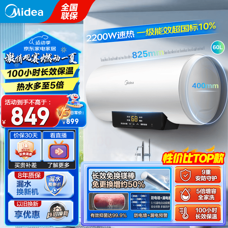 美的(Midea)储水式电热水器家用速热节能小钢炮数显超一级能效 长效免换镁棒加长防电墙智能家电6重防护X1 60L 2200W 2-3人洗【X1】价格:849.00元!