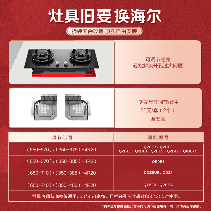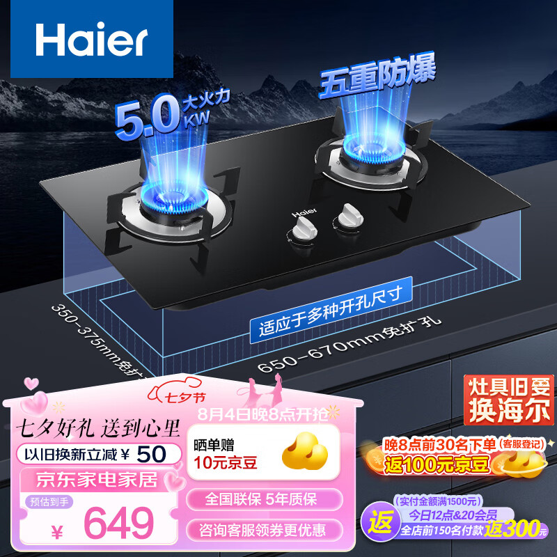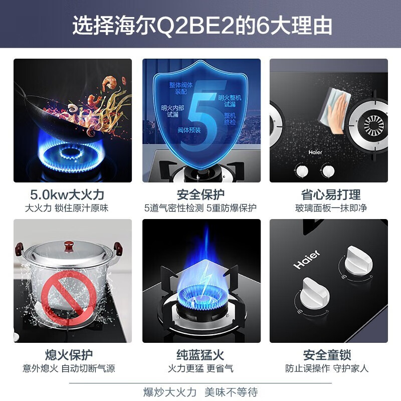 海尔(Haier)燃气灶 5.0kW大火力嵌入式瞬燃点火家用全进风钢化玻璃双眼煤气灶双灶 燃气灶天然气 Q2BE2价格:649.00元!