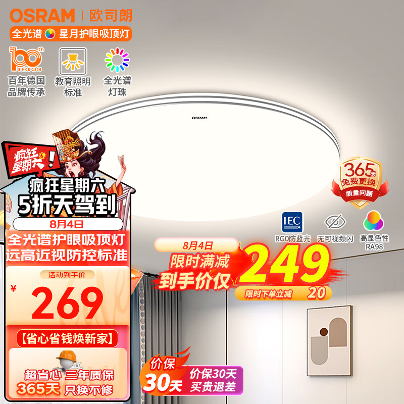 欧司朗(OSRAM)卧室灯吸顶灯led圆形护眼灯房间灯主卧灯具全光谱防蓝光灯超薄48W价格:519.00元!