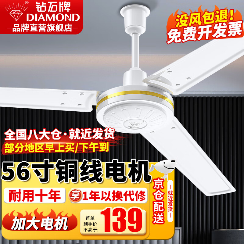 钻石牌(DIAMOND) 吊扇电风扇家用客厅1.4米56吋楼顶扇工业大风力吸顶电风扇 56寸大电机(铜线电机)价格:149.00元!