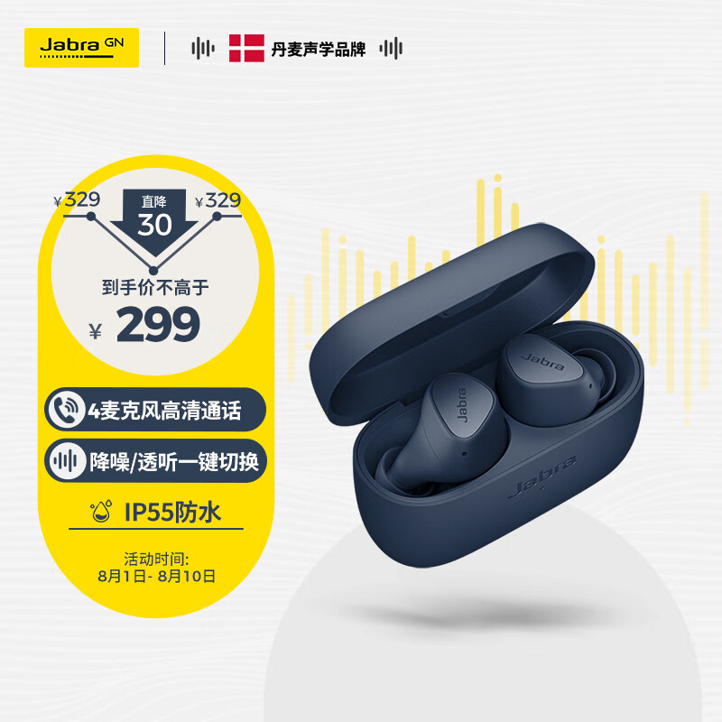 捷波朗(Jabra)Elite3 真无线蓝牙降噪耳机 蓝牙5.2 强劲续航(65t升级版E3) 安卓苹果音乐耳机 海军蓝色价格:329.00元!