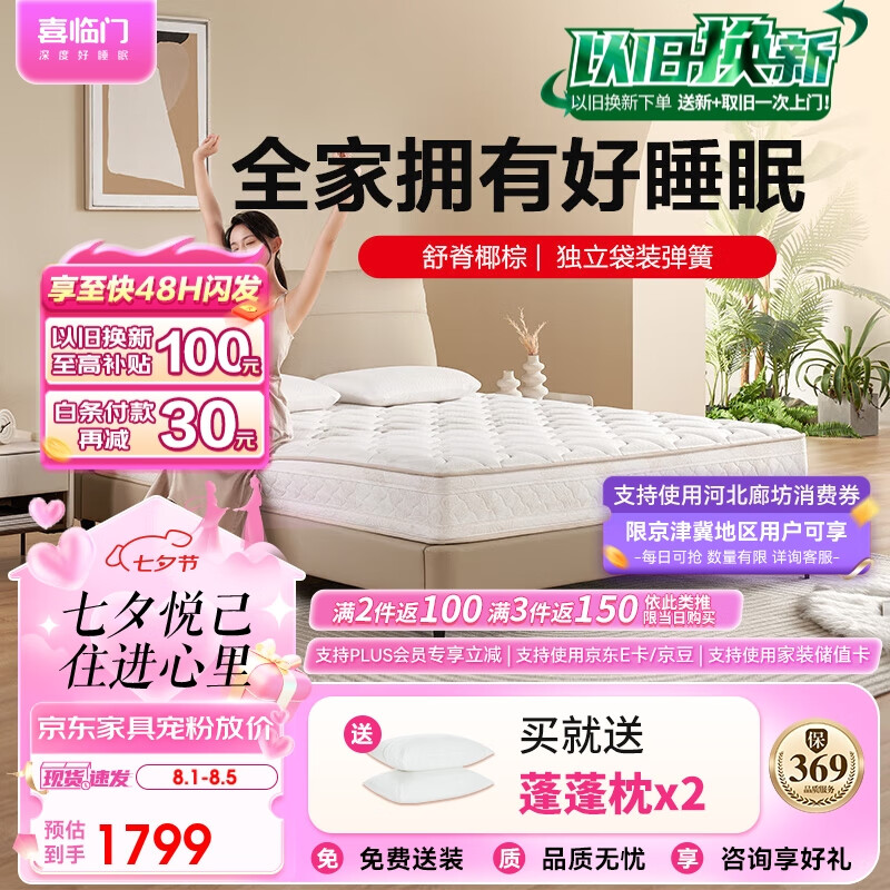 喜临门床垫 椰棕床垫 独袋弹簧偏硬床垫 塔利亚舒脊版1.5x1.9米价格:1799.00元!