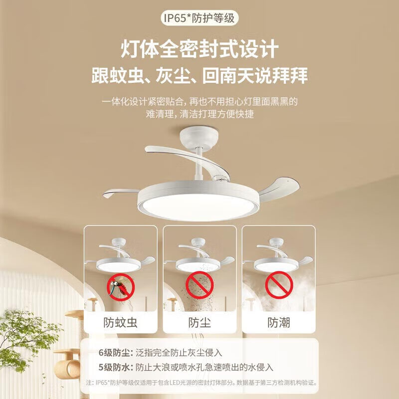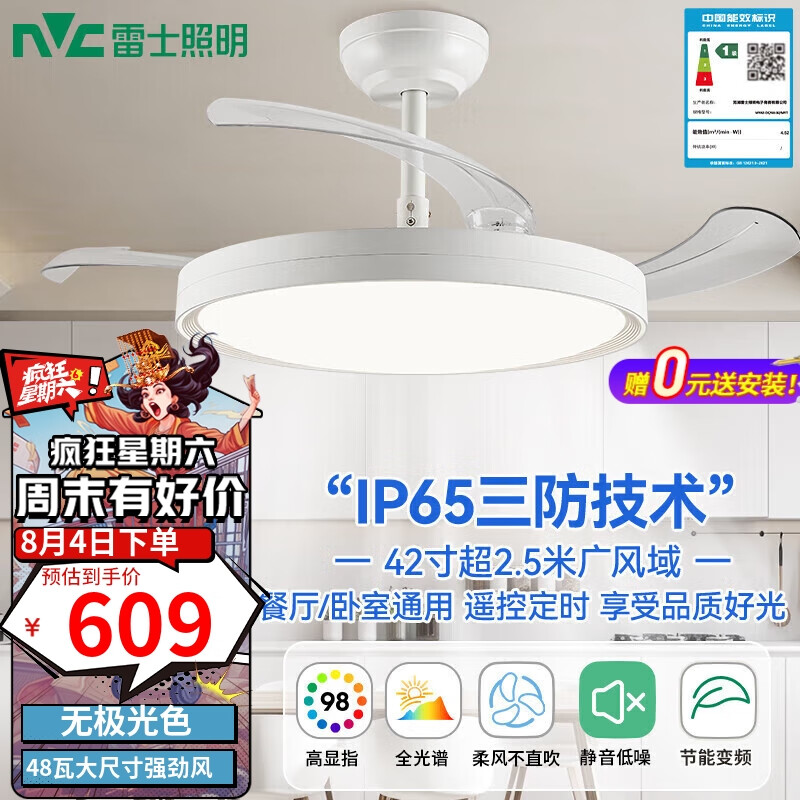 雷士(NVC)风扇灯吊扇灯隐形IP65三防白色餐厅卧室一级能效全光谱42寸48瓦价格:759.00元!