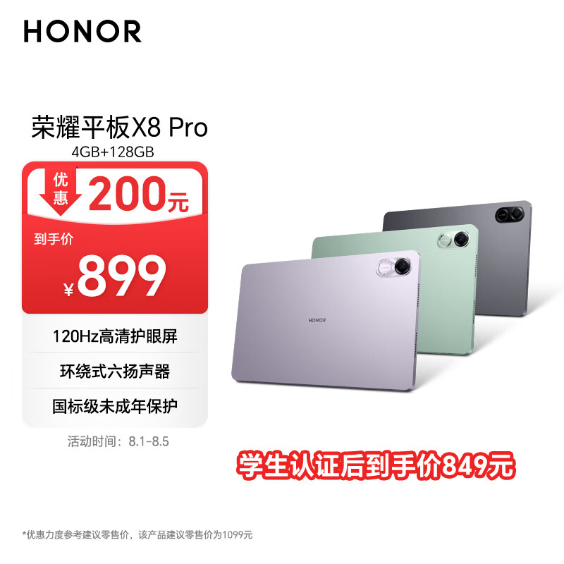 荣耀平板X8 Pro 11.5英寸平板电脑(4+128GB 2K高清120Hz高刷护眼屏 全金属轻薄机身)星空灰价格:899.00元!