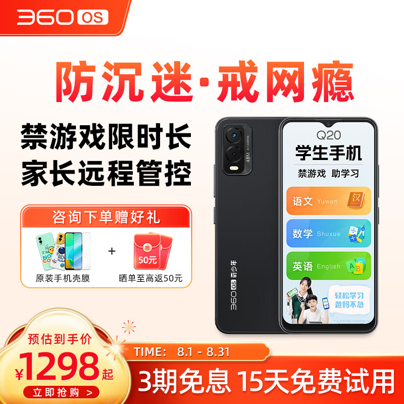 360 OS学生手机 初中儿童小学高中青少年专用 防沉迷戒网瘾 家长可控 Q20子夜黑6G+128G 管控+学习版价格:1298.00元!