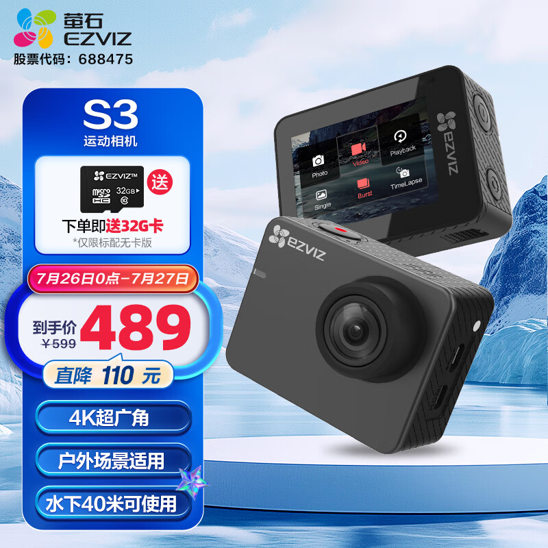 萤石S3运动相机 4K超广角 超清防抖 海康威视旗下 户外骑行 摩托滑雪防水记录 摄像机 Vlog便携相机价格:475.00元!