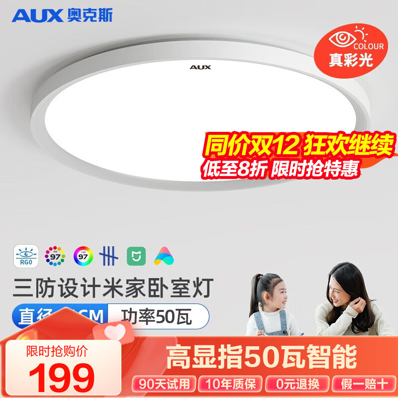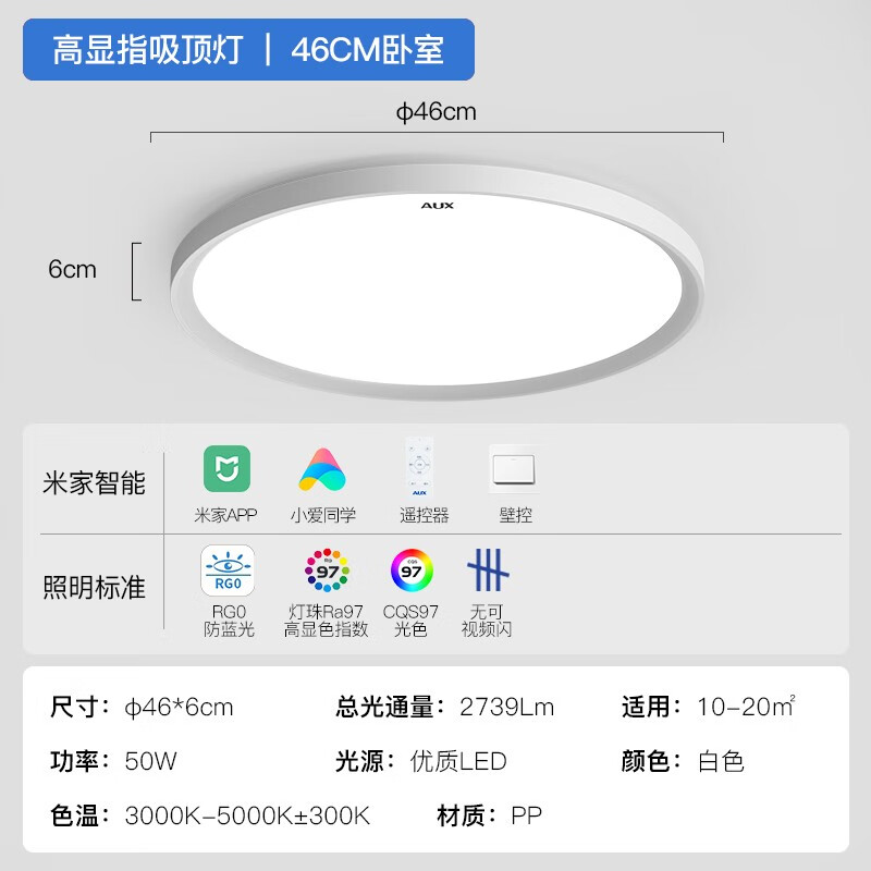 奥克斯(AUX)照明全光谱护眼吸顶灯卧室灯健康护眼书房儿童房防眩无蓝光灯具 三防升级50瓦米家智控护眼适20㎡价格:221.00元!