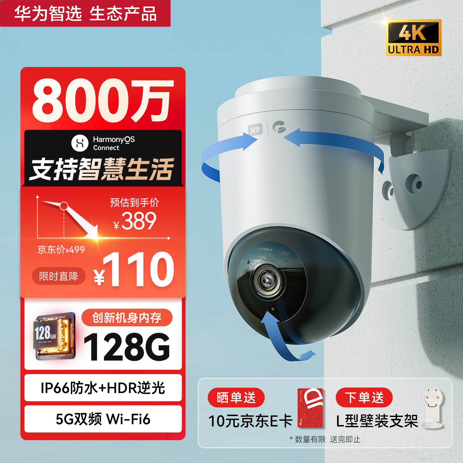 华为智选4K 800万摄像头室外监控器360度旋转高清无死角带夜视 手机远程告警农村家用门口庭院全景看护海雀价格:499.00元!