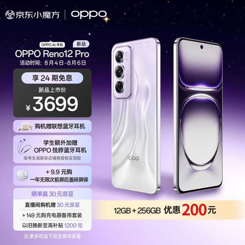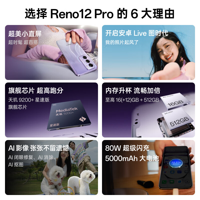 OPPO Reno12 Pro 超美小直屏 安卓Live图 天玑旗舰芯 16GB+256GB 银幻紫 新款智能游戏 AI拍照 5G手机价格:3699.00元!