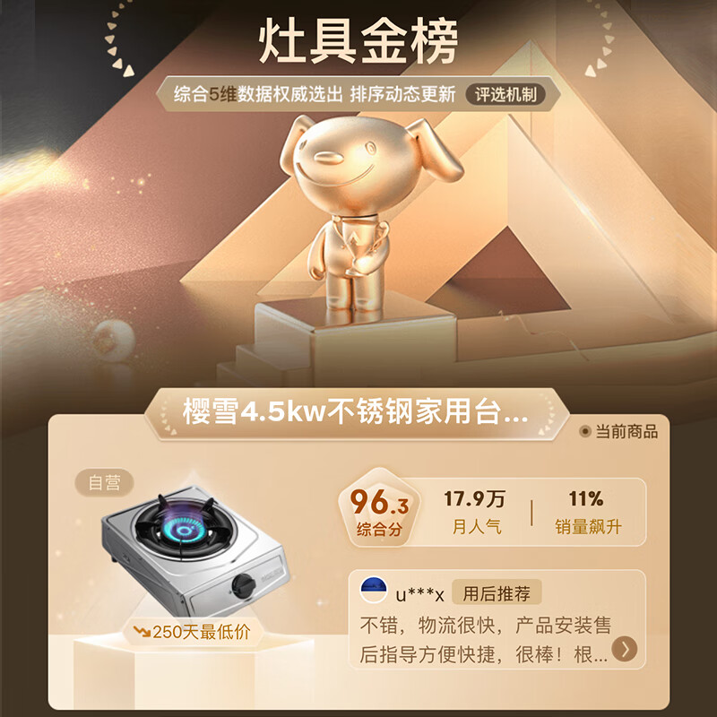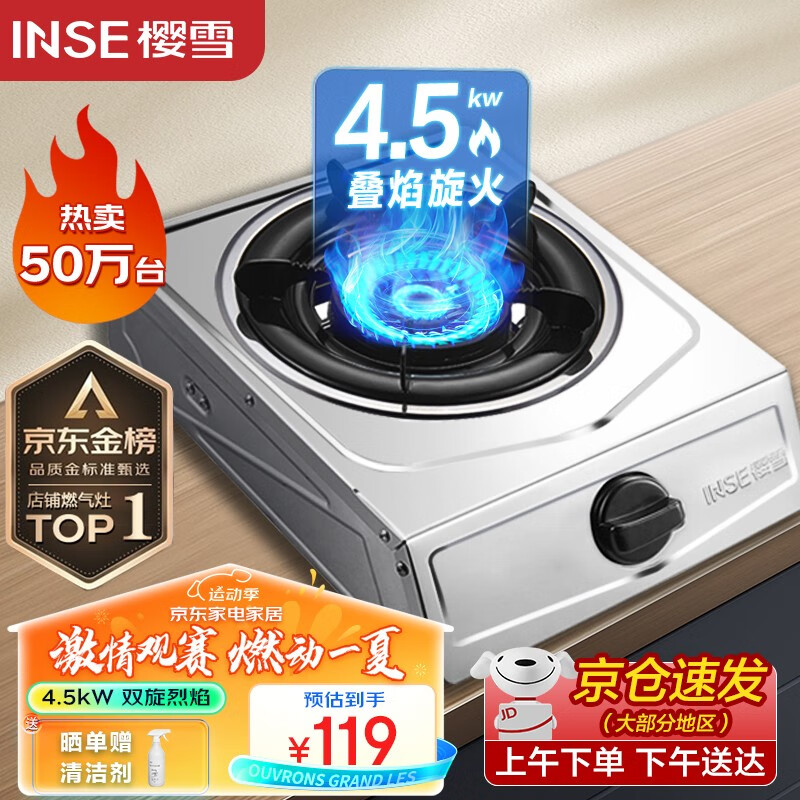 樱雪(INSE)燃气灶单灶 台式不锈钢面板4.5kW火力煤气灶单灶 家用猛火节能单眼灶 JZY-T1501(G)W液化气价格:119.00元!