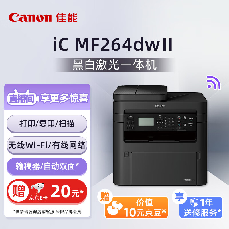 佳能(Canon)MF264dwⅡ A4幅面无线黑白激光多功能一体机(打印/复印/扫描/输稿器/自动双面打印 商用)价格:2549.00元!