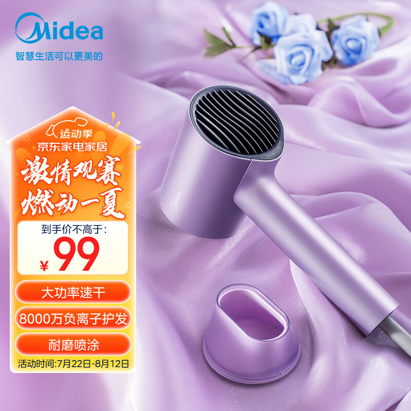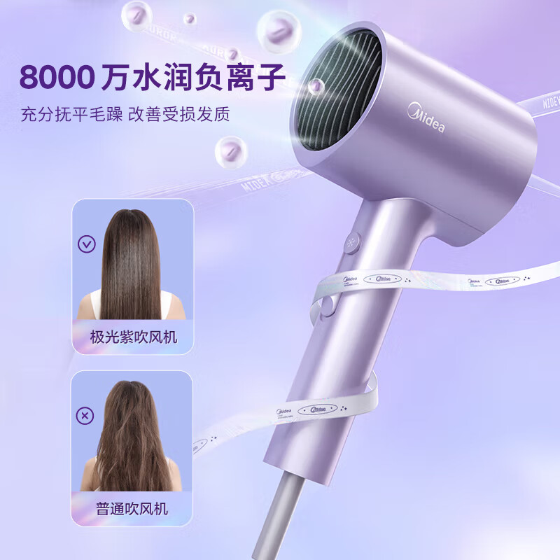 美的(Midea)八千万负离子电吹风 大功率 家用速干柔顺护发吹风筒 电吹风机 节日礼物 MB-AJ0504极光紫价格:99.00元!